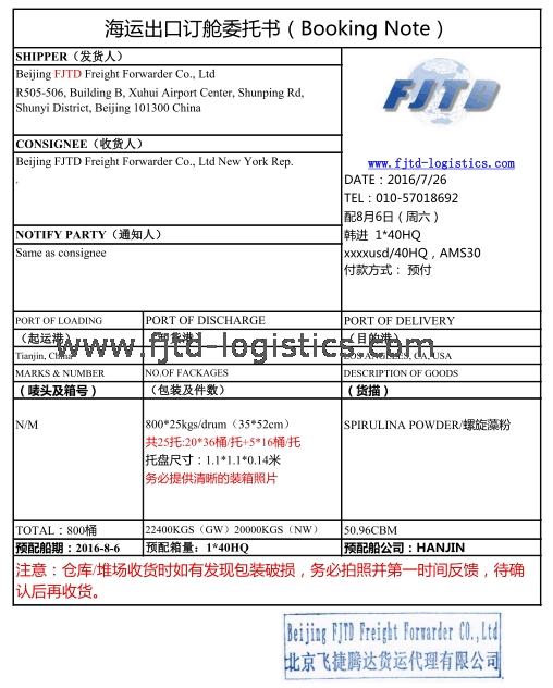 Beijing FJTD Freight Forwarder Co., LtdDATE:2016/7/26