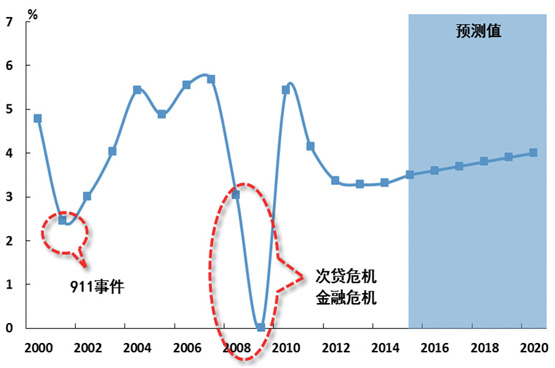 外貿(mào)保持穩(wěn)定增長,與經(jīng)濟彈性進一步下降。在加入WTO的帶動下,2000-2007年我國外貿(mào)進出口總額保持了24.3%的年均增長(如圖8所示),與 GDP的彈性系數(shù)高達2.25,明顯高出世界1.5的平均水平,成為世界重要經(jīng)貿(mào)大國。受到金融危機沖擊和全球貿(mào)易放緩的影響,面對國內(nèi)外復(fù)雜形勢,2007-2014年我國對外貿(mào)易仍保持較快發(fā)展,外貿(mào)進出口總額年均增速達到10.2%,國際貿(mào)易地位不斷提高,成為世界第一貨物貿(mào)易大國。隨著貿(mào)易依賴度的提高,進出口彈性逐步下降,由2.25下降為1.16?!笆濉逼陂g我國對外貿(mào)易發(fā)展將面臨更加復(fù)雜的國際環(huán)境,將逐步轉(zhuǎn)入平穩(wěn)發(fā)展階段,與 GDP的彈性下降為1.0,外貿(mào)進出口總額增速保持在6.6%與GDP相當(dāng)?shù)乃健?br />  貿(mào)易區(qū)域結(jié)構(gòu)不斷優(yōu)化,貿(mào)易伙伴保持多元化趨勢。隨著我國經(jīng)濟社會發(fā)展水平的提高,貿(mào)易呈現(xiàn)多元化發(fā)展趨勢,特別是金融危機后,亞洲、歐洲和北美洲占貿(mào)易比重由2007年的89.6%逐步降為2014年的85.1%,美國、歐盟和日本所占比重由41.1%降為34.4%,而非洲、拉丁美洲所占貿(mào)易比重則由 8.1%上升為11.3%。隨著世界貿(mào)易格局的調(diào)整,以及我國“一帶一路”戰(zhàn)略的推進,對外貿(mào)易結(jié)構(gòu)將進一步優(yōu)化,與東盟、非洲等海上絲綢之路沿線國家貿(mào)易比重進一步上升。