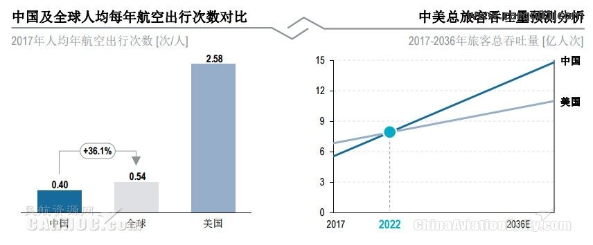 但是,我們會看到,其實這里面如果平均到中國的單人次的話,我們中國現(xiàn)在每年平均人出行,就是13億人口平均下來的話,每人、每年的出行可能也就有0.4次。全球的平均水平是0.54次。如果我們再拿比較發(fā)達的美國市場去做對比的話,它們的人均是2.58次,所以可以見到這里面的差距,或者從另外的一個角度來說這里面的潛力還是非常巨大的。隨著我們?nèi)司鲂械奶嵘?,我們預測,其實中國可能在2022年就會超過美國,成為全球最大的單一航空市場。
