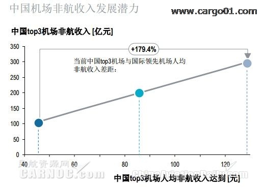 我們剛才講到的三個頭部機場:浦東、首都機場、白云機場,這三個平均數(shù)據(jù)用最左邊藍點表示,最右邊淺藍色是一些國際領先的。我們會看到,如果在這方面獲得提升,這三個機場的非航收入提升潛力非常大。如果是跟國際水平比,現(xiàn)在人均46元,實現(xiàn)總非航收入一年大概107億元,我們跟國際差距縮小一半,基本上實現(xiàn)翻倍。如果是完全達到現(xiàn)在國際的領先水平,在我們現(xiàn)在非航收入水平上,基本上達到一個額外2倍,總的3倍的增長。