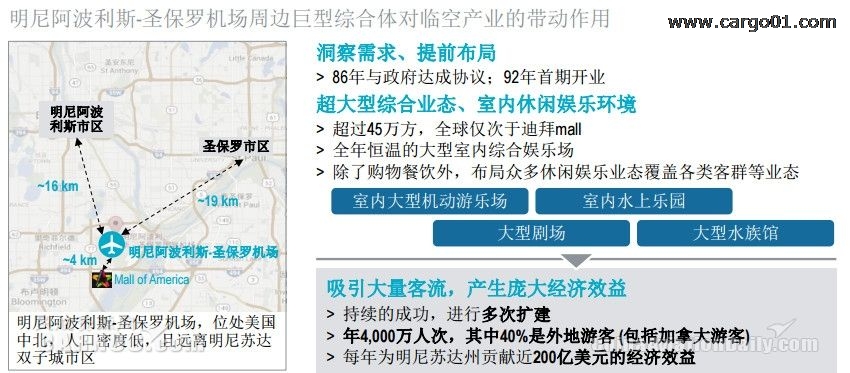 商業(yè)角度再舉一個例子,美國明尼阿波利斯機場打造了一個Mall of America,從1986年與政府達成協(xié)議開始,1992年首期開業(yè),現(xiàn)在一直在建設,體量規(guī)模在全球范圍內(nèi)僅次于迪拜mall。它離機場有4公里的距離,但是發(fā)展成為全美最大的購物中心。這里面有40%的客流來自于外地,這個mall里面有綜合型設施,像樂高商店、游樂園、水族館等等。有很多人專門到這個項目里來,帶動了機場。