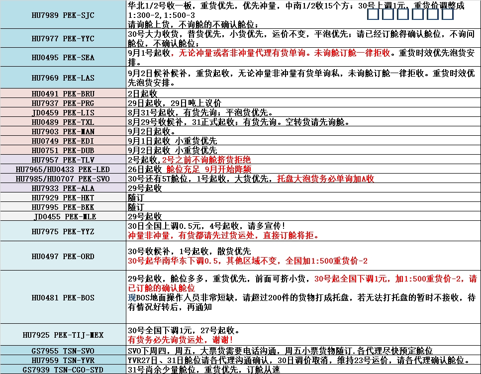 PEK-ORD華南華東下調(diào)0.5,華北不變,全國(guó)加1:500重貨價(jià)-2。