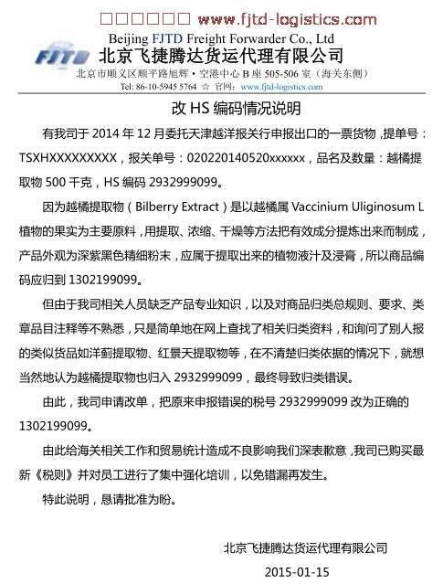 茲有我司于2014年12月委托天津越洋報關(guān)行申報出口的一票貨物,提單號:TSXHXXXXXXXXX,報關(guān)單號:020220140520xxxxxx,品名及數(shù)量:越橘提取物500千克,HS編碼2932999099。