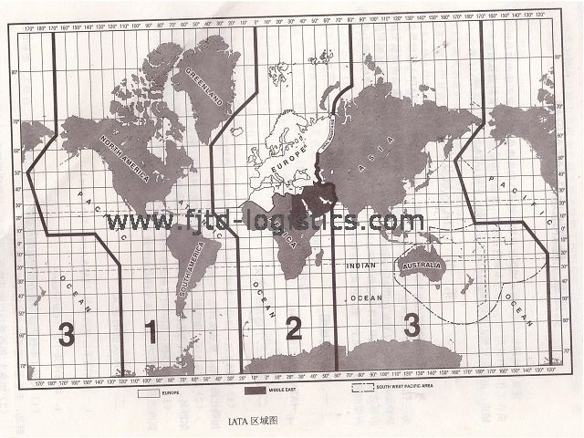 為了制定國際空運中運價的計算規(guī)則,國際航空運輸協(xié)會(IATA)把全球劃分為三個大的區(qū)域,及各大區(qū)下面又細(xì)分為多個小區(qū)域(次區(qū))。這樣劃分出的區(qū)域稱為“國際航空運輸協(xié)會運價協(xié)調(diào)區(qū)(IATA Traffic Conference Areas)”,簡稱IATA區(qū)域。