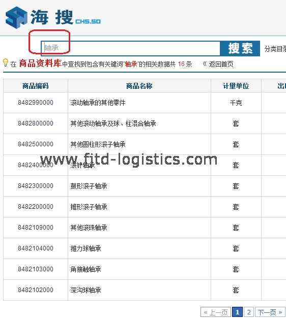 輸入“軸承”,點(diǎn)擊“搜索”,出來幾十條相關(guān)內(nèi)容(出來越多,說明這個(gè)品名越常見;越常見的品名,越容易確定HS編碼)