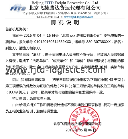 經(jīng)常做報(bào)關(guān)的應(yīng)該知道,在進(jìn)出口申報(bào)中,并不是所有的申報(bào)錯(cuò)誤都可以申請(qǐng)更改的,尤其是海關(guān)放行之后。如果你認(rèn)為申報(bào)有誤,需要改單,就要寫《情況說(shuō)明》,向海關(guān)書(shū)面解釋錯(cuò)誤的原因、類型以及如何更改。海關(guān)會(huì)根據(jù)相關(guān)規(guī)定確定你的更改申請(qǐng)是否合理。如果合理,給予更改;如果不合理,不給更改。