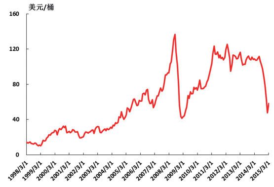 大宗資源類價格進入一輪低谷。在上一輪世界經(jīng)濟快速增長的帶動下,對石油、鐵礦石等資源類商品需求快速增長,天平向供給方傾斜,推動了資源價格大幅度上漲(如圖3和圖4所示),同時也刺激資本對資源開發(fā)、生產(chǎn)投入大幅度增長。在世界經(jīng)濟增速放緩、生產(chǎn)率效率持續(xù)提高和日益注重節(jié)能減排的背景下,需求減弱,而產(chǎn)出穩(wěn)定增長,供需關(guān)系出現(xiàn)了失衡,天平向需求方傾斜,資源價格開始大幅下跌。石油價格一度跌至40多美元,中國鐵礦石到岸價也跌至60-70美元的水平(如圖3和圖4所示)。從多個機構(gòu)的預(yù)測來看,今后一個時期大宗商品價格很難有大幅提升。