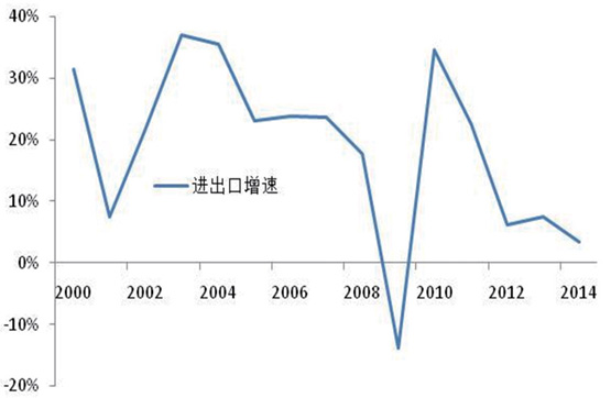 外貿(mào)保持穩(wěn)定增長,與經(jīng)濟彈性進一步下降。在加入WTO的帶動下,2000-2007年我國外貿(mào)進出口總額保持了24.3%的年均增長(如圖8所示),與 GDP的彈性系數(shù)高達2.25,明顯高出世界1.5的平均水平,成為世界重要經(jīng)貿(mào)大國。受到金融危機沖擊和全球貿(mào)易放緩的影響,面對國內(nèi)外復(fù)雜形勢,2007-2014年我國對外貿(mào)易仍保持較快發(fā)展,外貿(mào)進出口總額年均增速達到10.2%,國際貿(mào)易地位不斷提高,成為世界第一貨物貿(mào)易大國。隨著貿(mào)易依賴度的提高,進出口彈性逐步下降,由2.25下降為1.16?!笆濉逼陂g我國對外貿(mào)易發(fā)展將面臨更加復(fù)雜的國際環(huán)境,將逐步轉(zhuǎn)入平穩(wěn)發(fā)展階段,與 GDP的彈性下降為1.0,外貿(mào)進出口總額增速保持在6.6%與GDP相當(dāng)?shù)乃健?br />  貿(mào)易區(qū)域結(jié)構(gòu)不斷優(yōu)化,貿(mào)易伙伴保持多元化趨勢。隨著我國經(jīng)濟社會發(fā)展水平的提高,貿(mào)易呈現(xiàn)多元化發(fā)展趨勢,特別是金融危機后,亞洲、歐洲和北美洲占貿(mào)易比重由2007年的89.6%逐步降為2014年的85.1%,美國、歐盟和日本所占比重由41.1%降為34.4%,而非洲、拉丁美洲所占貿(mào)易比重則由 8.1%上升為11.3%。隨著世界貿(mào)易格局的調(diào)整,以及我國“一帶一路”戰(zhàn)略的推進,對外貿(mào)易結(jié)構(gòu)將進一步優(yōu)化,與東盟、非洲等海上絲綢之路沿線國家貿(mào)易比重進一步上升。