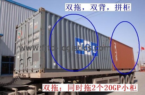 3)“雙拖”——1個拖頭(拖車),一次性拉兩個小柜,通常是兩個20英尺的集裝箱,就是雙拖。
