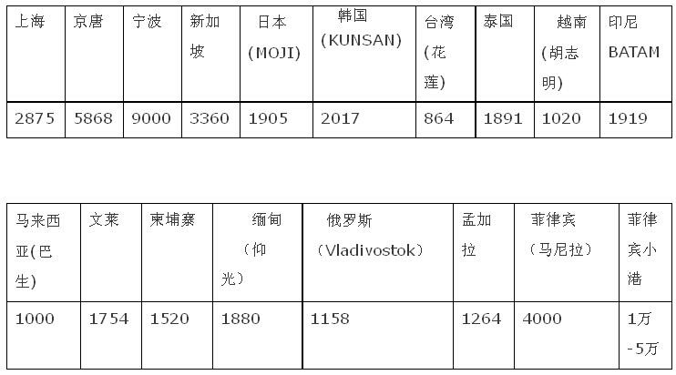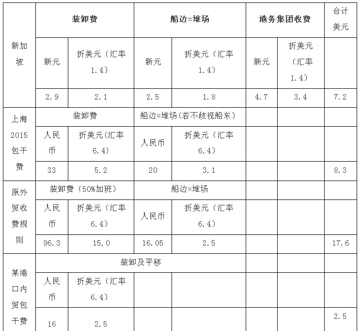 從上表對(duì)比可以見(jiàn),上海港的2015年包干裝卸費(fèi)已趨合理,盡管比新加坡稍高,但是提供港方機(jī)械,裝卸速度大為提高。當(dāng)然,新加坡的裝卸費(fèi)是很貴的,比臺(tái)灣、韓國(guó)貴得多,是泰國(guó)、越南的2-3倍。