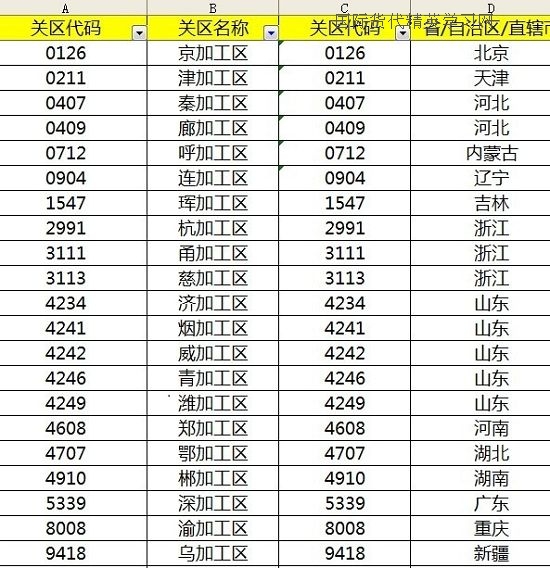 在海關(guān)《國(guó)內(nèi)地區(qū)代碼表》——境內(nèi)貨源地/目的地代碼表中,國(guó)家級(jí)出口加工區(qū)基本都是單獨(dú)列明,都有單獨(dú)的境內(nèi)貨源地/目的地代碼。比如:11115——北京天竺出口加工區(qū);12075——天津出口加工區(qū);37025——山東青島出口加工區(qū);31225——上海金橋出口加工區(qū)南區(qū);32055——江蘇蘇州工業(yè)園區(qū)加工區(qū);32235——江蘇昆山出口加工區(qū);35015——福建福州、福清出口加工區(qū);44035——廣東深圳出口加工區(qū);44235——廣東南沙出口加工區(qū);44015——廣東廣州出口加工區(qū);45055——廣西北海出口加工區(qū);61015——陜西西安出口加工區(qū)等。