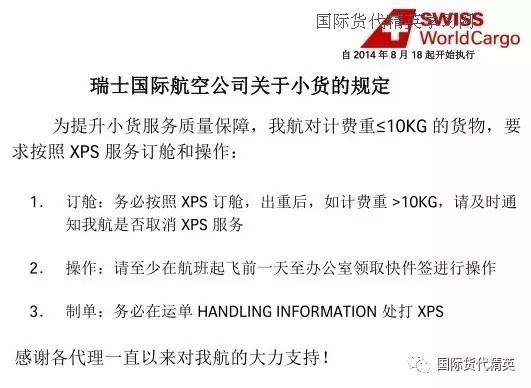 為提升小貨服務質(zhì)量保障,我航對計費重≤10KG的貨物,要求按照XPS(快件)服務訂艙和操作: