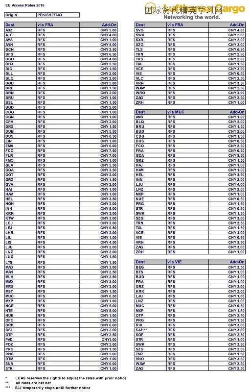 附:LH漢莎航空 中轉(zhuǎn)點(diǎn)-轉(zhuǎn)運(yùn)費(fèi)一覽表