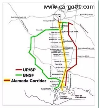 洛杉磯港原有的海鐵聯(lián)運(yùn)設(shè)施是由兩家知名的美國(guó)鐵路公司運(yùn)營(yíng)的。一是北伯靈頓圣塔菲鐵路公司(BNSF),通常美國(guó)同行把這家公司稱為西部鐵路公司,這家公司的貨運(yùn)版圖主要集中在美國(guó)的中部和西部;另一個(gè)是聯(lián)合太平洋鐵路運(yùn)輸公司(UP)。這兩家鐵路公司在該區(qū)原有四條單向鐵路引入港口,他們采用的重載列車最長(zhǎng)可達(dá)2.5公里,四條鐵路與城市道路形成200個(gè)平面交匯道口,每天約有35列火車,以32公里/小時(shí)的時(shí)速通過這些道口。這種局面如不改善,港口與城市的矛盾將不堪設(shè)想。