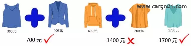 4. 假如說,你買了2件不同款式的衣服,總價700元,則未超限;2件不同款式的衣服,總價1400元,就超限了哦;但如果是1件衣服,價值1700元,由于是“單件不可分割”的,就不算超限。
