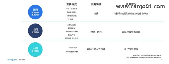 菜鳥物流網(wǎng)可拆分成天網(wǎng)、地網(wǎng)和人網(wǎng)3大版塊。天網(wǎng)是由數(shù)據(jù)驅(qū)動的云供應(yīng)鏈協(xié)同平臺,強(qiáng)調(diào)電子商務(wù)及物流數(shù)據(jù)的交互和分享;地網(wǎng)是借由龐大的地面網(wǎng)絡(luò)不斷聚集貨物、人氣,讓天網(wǎng)的數(shù)據(jù)能力落地;人網(wǎng)是主打“最后一公里”物流服務(wù)和基于消費者真實生活中各種場景下的便民服務(wù)。