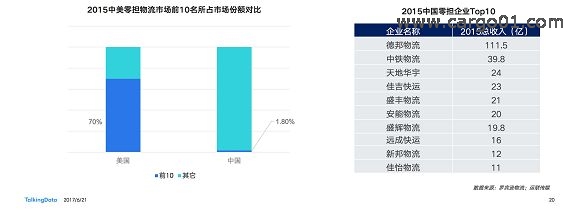 中國公路運輸?shù)钠髽I(yè)有78萬家,“小”“散”“亂”“差”是行業(yè)最主要的問題。他們經(jīng)常表現(xiàn)為一人一車一電話的作坊模式。中國零擔(dān)市場前10名市場份額之和占行業(yè)整體的1.8%,美國零擔(dān)市場前10市場份額之和卻高達(dá)70%。頭部廠商的市場份額大,有利于充分調(diào)配資源,達(dá)到降低成本提升效率的目的。