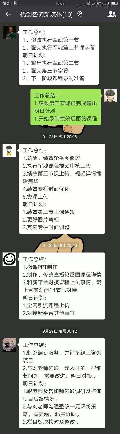 其實今天在管理當中一日之計在于晨是不對的,過去我經(jīng)常講叫真正的計劃是什么,就是叫一日之計在于昨日星晨,很多優(yōu)秀的人其實在昨天晚上就已經(jīng)想好明天要做什么事情了,明天要達到什么樣的工作計劃和結(jié)果,所以我們來看,我們優(yōu)創(chuàng)自己的員工是如何通過微信群來匯報他的結(jié)果和計劃的:
