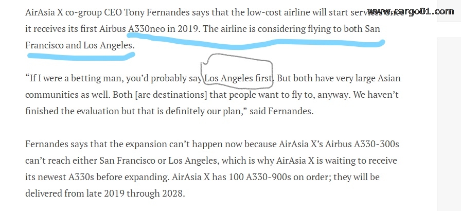 據(jù)Aeronauticsonline報(bào)道,亞航總裁Tony Fernandes表示,亞航在2019年接收首架空客A330neo后,將開通舊金山和洛杉磯航線。